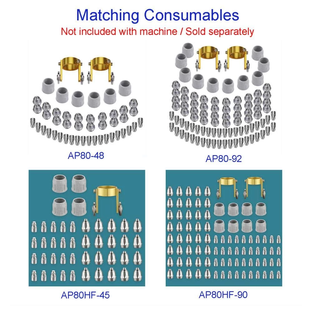 APC-60HF is the newest model of the professional digital control high frequency start plasma cutting machine with built-in advanced inverter technology. Its high-quality design was manufactured in accordance with industrial level standards. The machine has a high-cutting performance and is very user-friendly with a beautiful appearance and exquisite production technology. The instrument and air pressure regulator are installed inside the machine on the panel, making it more convenient and easier to use. The air filter is installed in the machine and is controlled automatically by a solenoid valve, which greatly improves the work efficiency. The normal cutting thickness of APC-60HF air plasma cutting machine is 1.0 inch, and the maximum cutting thickness is 1.2 inches. Supply Power: AC 90V to 300V, 50/60Hz; Rated Input Current: 230V/46 Amp, 115V/55 Amp; Cutter Current Range: 230V/20-60 Amp, 115V/20-50 Amp; Nominal DC Open Circuit Voltage: 265-Volt; Output Voltage: 104-Volt; Duty Cycle @ 104F(40c): 80% @ 60 Amp; Gas Supply: Clean Dry Oil-Free Air; Gas Pressure Range: 30-80 psi; Recommended Gas Inlet Flow: 5.5scfm @ 80 psi; Standard Severance Cutting Thickness: 1.0 in.; Maximum Severance Cutting Thickness: 1.2 in.; Movement Speed: 15.0 in./min; Net Weight: 30.0 lbs.; Product Size: 20.0 x 8.7 x 15.7 in. Power Cord is 8 Feet Long; US Power Plug is XN650P-B (N6-50P). Included – 13 Feet / 80A Plasma Torch; 10-Feet 300A Work Clamp; 230-Volt to 115-Volt Power Adapter.