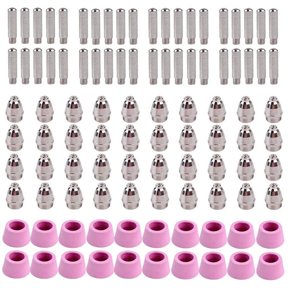 AMICO POWER Designed Professional Consumables Set for Models CUT-50, CUT-60, APC-50, APC-60, CUT-55M and CTS-200. High Quality 50-60 Amp (SG-55/AG-60) Plasma Cutter Torch Consumables. Package Includes: 40-pieces Nozzles, 40-pieces Electrodes and 20-Pieces Ceramic Shield Cups, Totally 100-Piece of Consumables, Nozzles and Electrodes are made by 100% Copper.