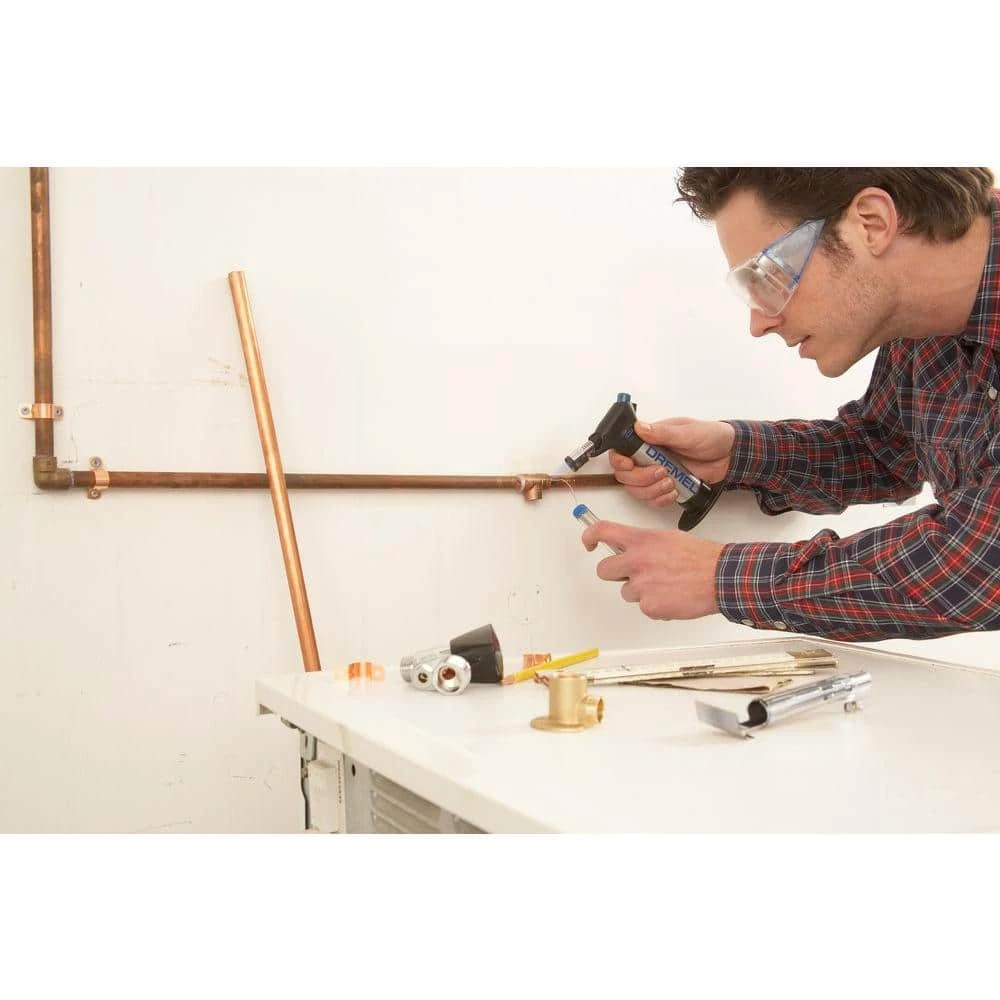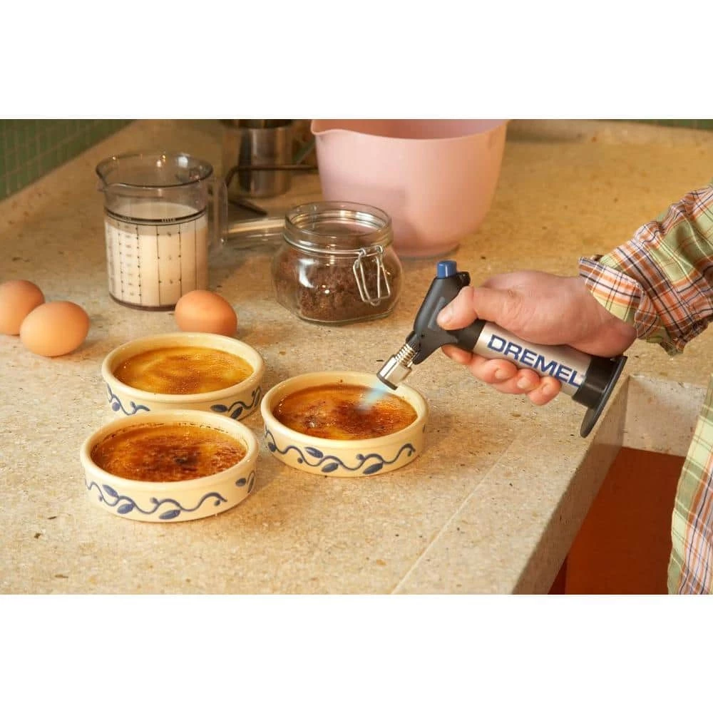 The Dremel VersaFlame multi-function butane torch produces variable temperature and is equipped with flame control features for both torch and standard flame operation. The VersaFlame is a highly portable tool that can be used for applications such as soldering, pipe fitting, shrinking and even culinary brazing. The VersaFlame also features a self-ignition button with safety lock, and a flame lock-on for continuous hands-free operation. The large tank capacity with standard butane gas allows for up to 75 minute run time. Kit contents include Versa Flame tool, storage case, blower, deflector, flame diffuser, soldering tip, solder, sponge, tins, and wrenches.