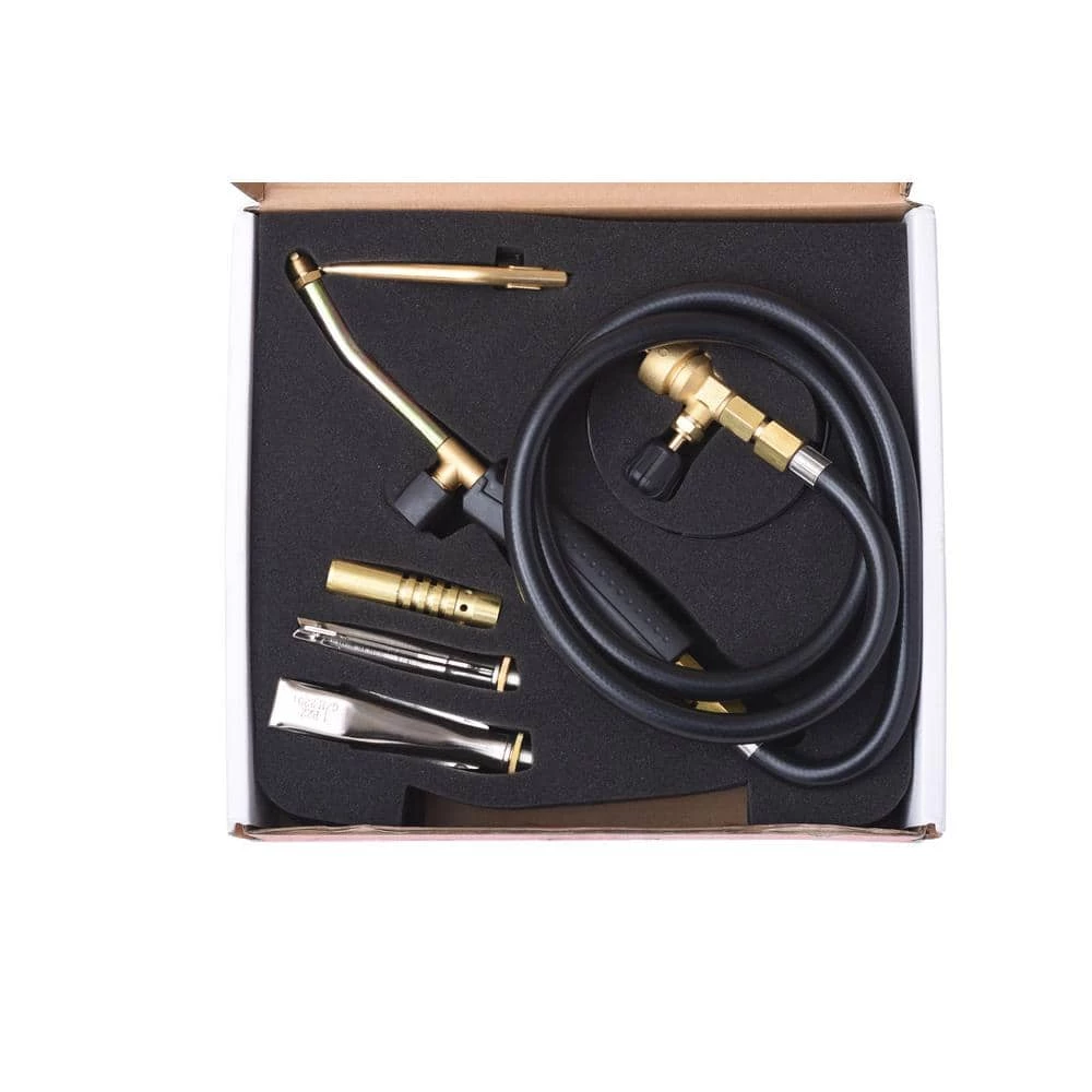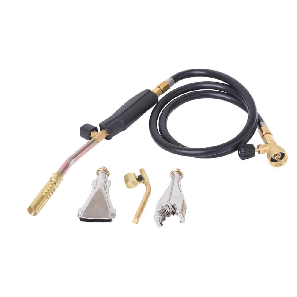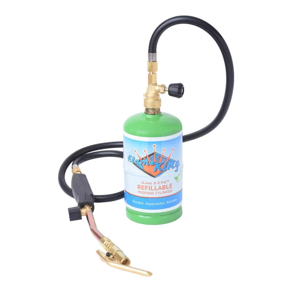 The AX1-092 Torch by Flame King includes three interchangeable tips that let you solder, thaw, sweat pipes and heat large surfaces. The propane torch set includes the torch, three burners, a 3/4 in. torch nozzle, a 7/8 in. brazing tool for copper pipes, a 1-1/2 in. flat burner, a soldering tool and a hose. Note: Flame King 1 lb. refillable cylinder not included.