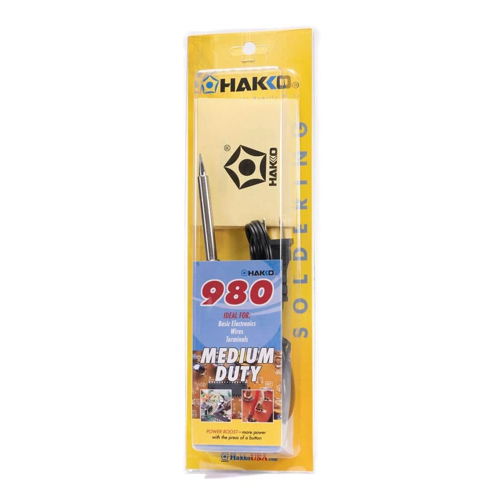 The Hakko dual-power soldering iron is a light-duty soldering iron with optional power. The user can increase the power from 20-watts to 130-watts with the press of a button. This iron is ideal for soldering applications that may need a boost of power for occasional heavy-duty soldering application.