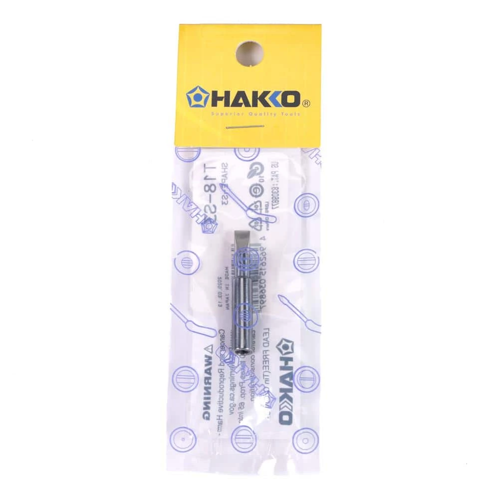 Hakko soldering iron tips are shaped from a copper bar then coated with protective iron plating. The plating is thick for long-life yet exhibits excellent heat conductivity for more efficient thermal recovery. Various shapes are available. The most popular shapes are pyramid, conical, bevel and chisel. The Hakko T18-S3 is a large chisel shape tip, which can be used for large soldering applications. For best performance, always use authentic Hakko soldering iron tips with Hakko soldering equipment.