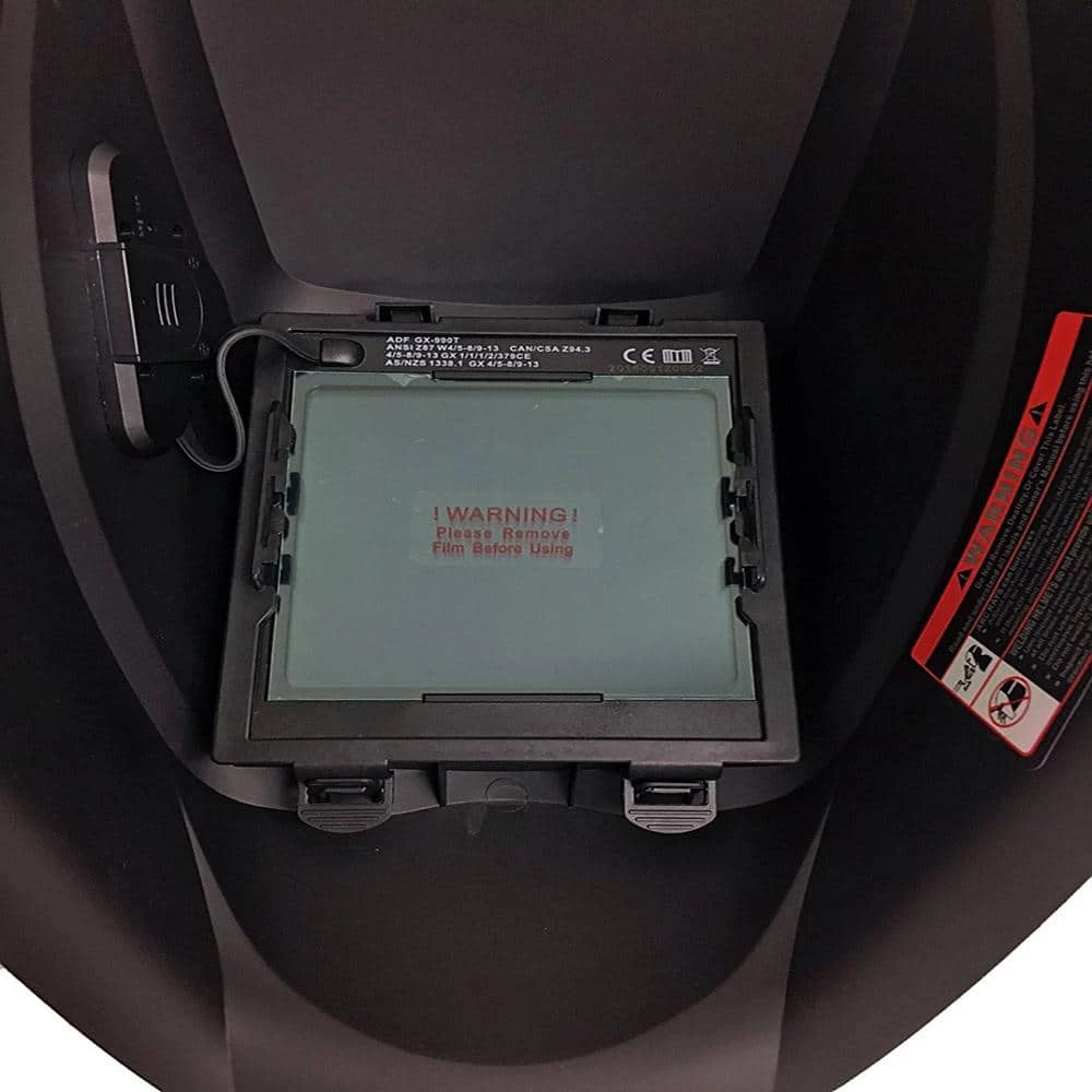 The Instapark ADF GX990T series welding helmet is equipped with 4 arc sensors that activate the auto-darkening filter to switch from light to dark automatically in a split second when an arc is struck. Combining with Instapark revolutionary new design with external controls and adjustments for dark state, sensitivity, and delay. Ergonomically designed and made of lightweight composite materials, the ADF GX990T welding helmet features a custom fit made possible by a ratcheting headband and padded interior. Its filter has a whopping 3.94 in. x 3.86 in. viewing area, the largest in its class, giving you a full view of your welding area and beyond with unparalleled optical clarity and complete UV/IR protection. Powered by built-in solar cells and 1 replaceable CR2450 battery. The ADF also has a variable dark shade adjustable from #5 to #13 with a resting shade of #4, suitable for most Stick, MIG (Metal Inert Gas) and TIG (Tungsten Inert Gas) applications.