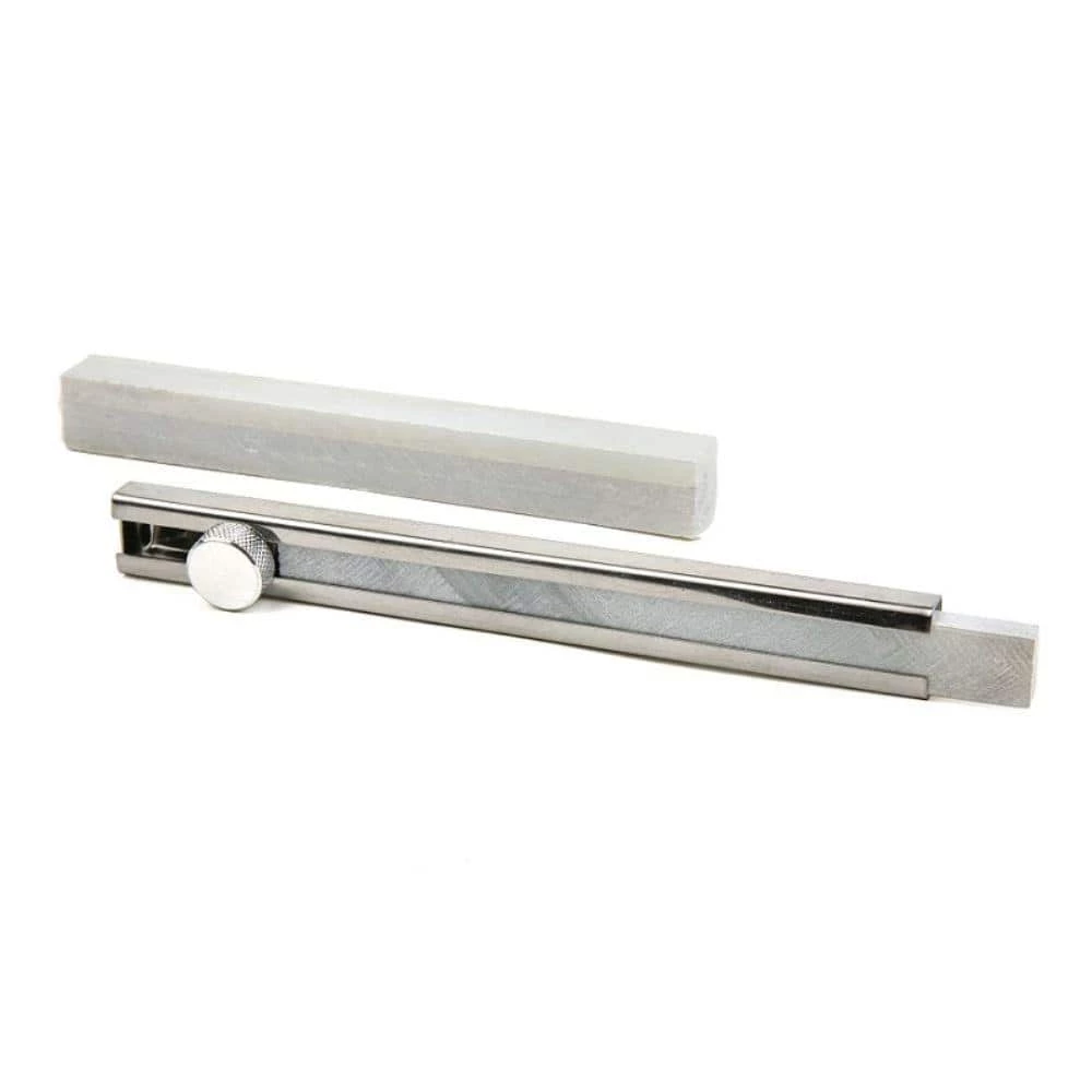 The Flat Soap Stone Holder with Soap Stones is made of stainless-steel. This flat stone holder features a built-in sharpener. Included with this stone holder is a pocket clip along with 3 soap stones.