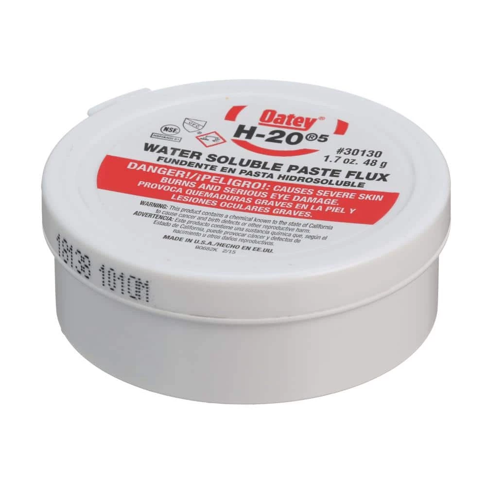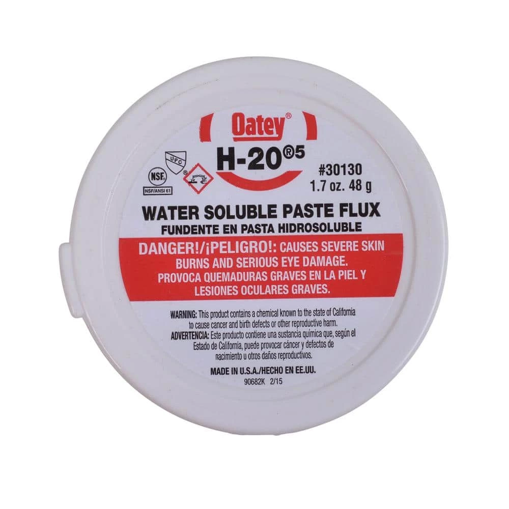 This Oatey H-20 1.7 oz. Water-soluble solder paste flux is designed for use in joining or sweating copper pipe and fittings. It meets ASTM standard B-813 and is approved for use by model plumbing codes. This paste contains no lead and will not turn copper pipe green.