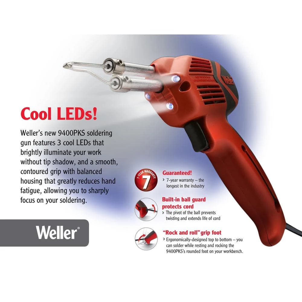 The Weller 100-Watt/140-Watt Soldering Gun Kit produces 100-Watt or 140-Watt heat and comes with 3 different tips for a wide variety of general soldering and hobby applications. The gun heats up in just 6-seconds and features a fingertip trigger with a dual-output selector. It offers a comfortable pistol-grip design with a rock and roll grip foot and 3 LED lights for shadow free illumination. The entire kit fits neatly in its own carry case.