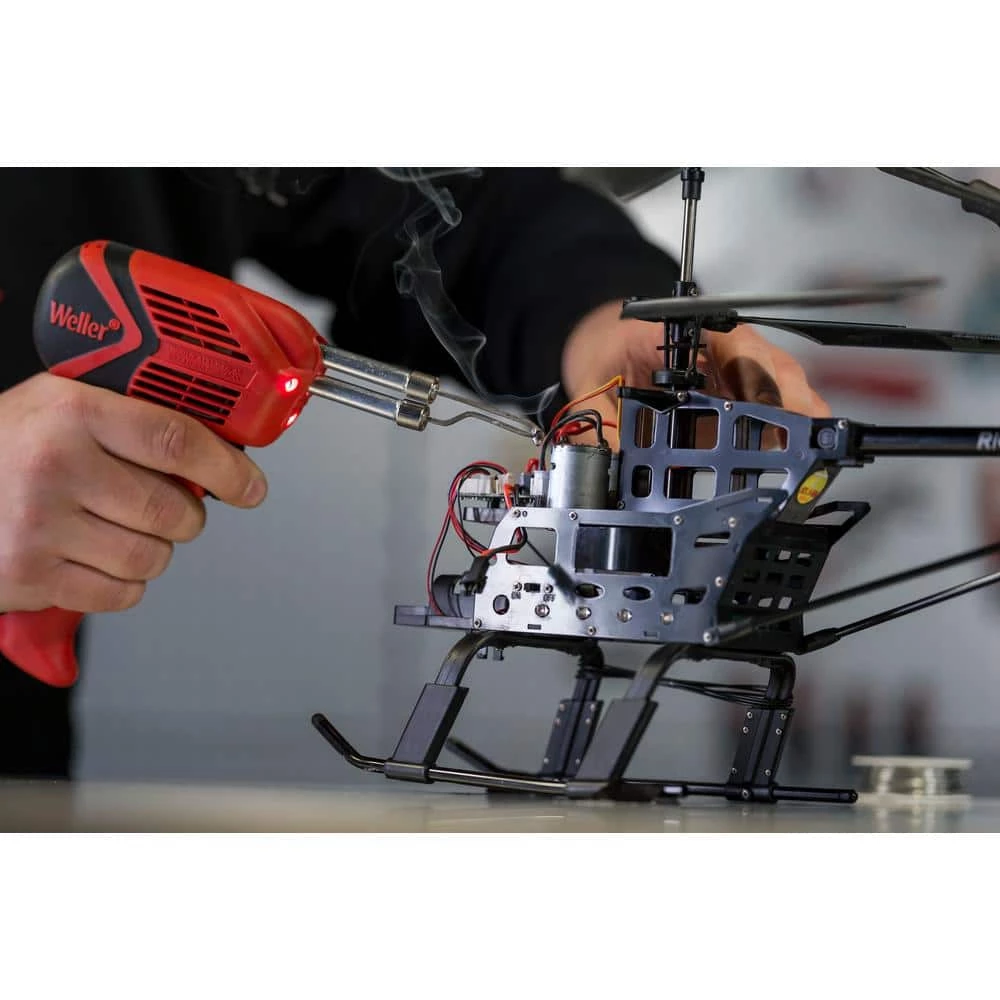 The Weller 100-Watt/140-Watt Soldering Gun Kit produces 100-Watt or 140-Watt heat and comes with 3 different tips for a wide variety of general soldering and hobby applications. The gun heats up in just 6 seconds and features a fingertip trigger with a dual-output selector. It offers a comfortable pistol-grip design with a rock and roll grip foot and 3 LED lights for shadow free illumination. The entire kit fits neatly in its own carry case.